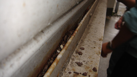 まず左右のガイドレールをみて、スラットとの接触部分に注油を行います(接触部分は光っています)。続いて、ガイドレール上部にある呑み口に注油を行います。注油に用いる油は市販のスプレーオイルで十分です。この注油によりシャッター動作音の大幅な軽減が期待できます。